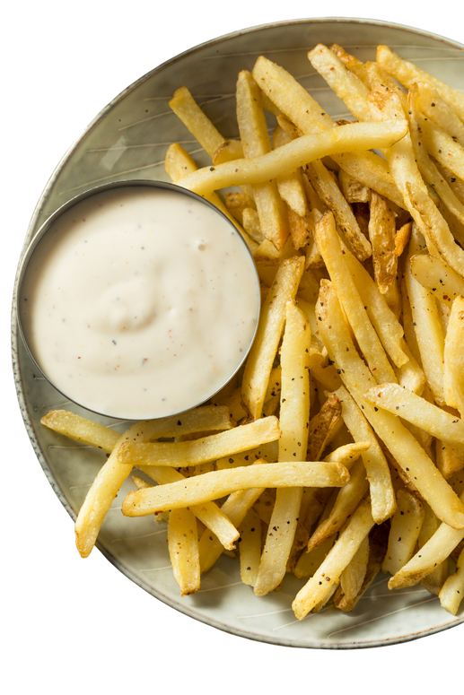 Plain fries topped with feta cheese crumbles, red onion, sprinkled with a Greek seasoning blend & drizzled with tzatziki sauce.